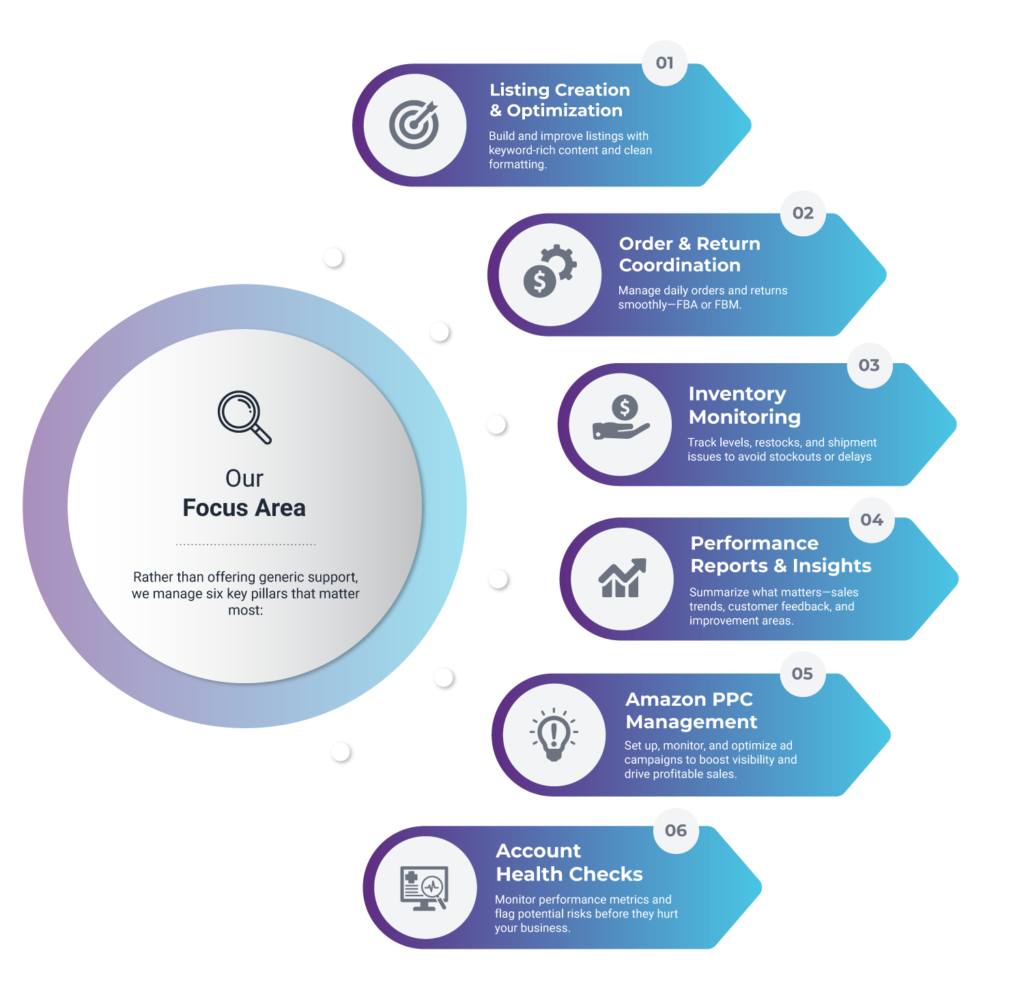 We offer three flexible packages aligned with your operational needs, covering listing optimization, day-to-day account management, or end-to-end store operations.